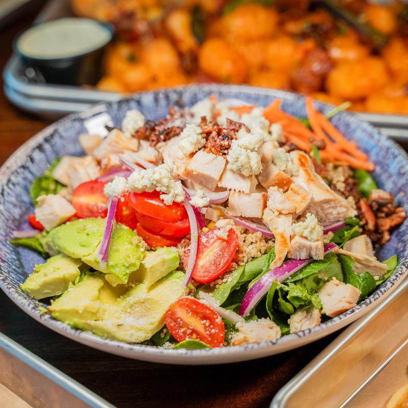 Quinoa, baby spinach, grape tomatoes, hard-boiled egg, blue cheese crumbles, sliced avocado, julienne carrots, bacon pieces, grilled chicken, pecorino, sliced red onion, your choice of dressing.