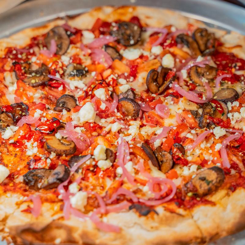 House-made San Marzano tomato sauce, mozzarella, feta, kalamata olives, Roma tomatoes, peppadew peppers, pickled shaved red onions, and sautéed wild mushrooms.